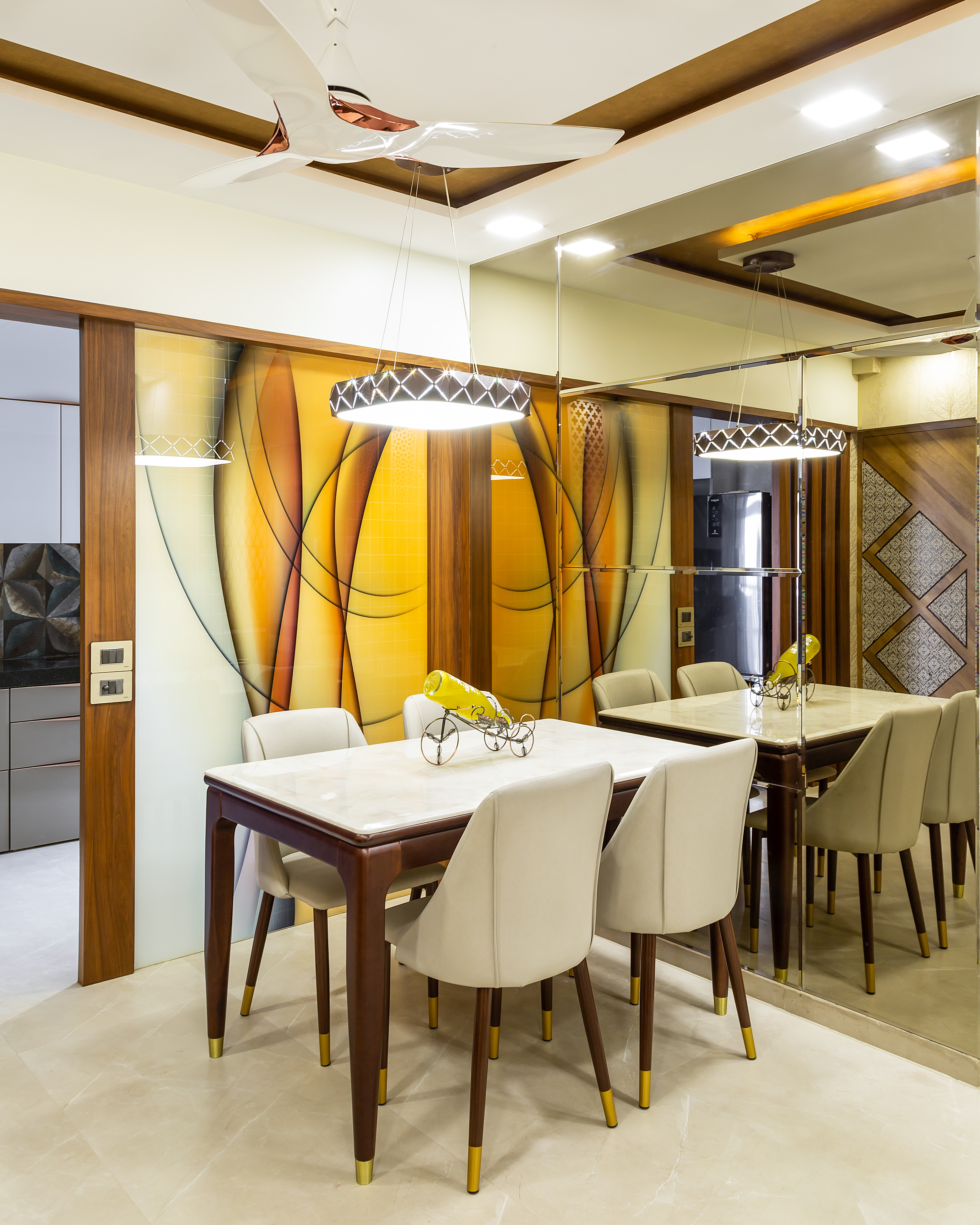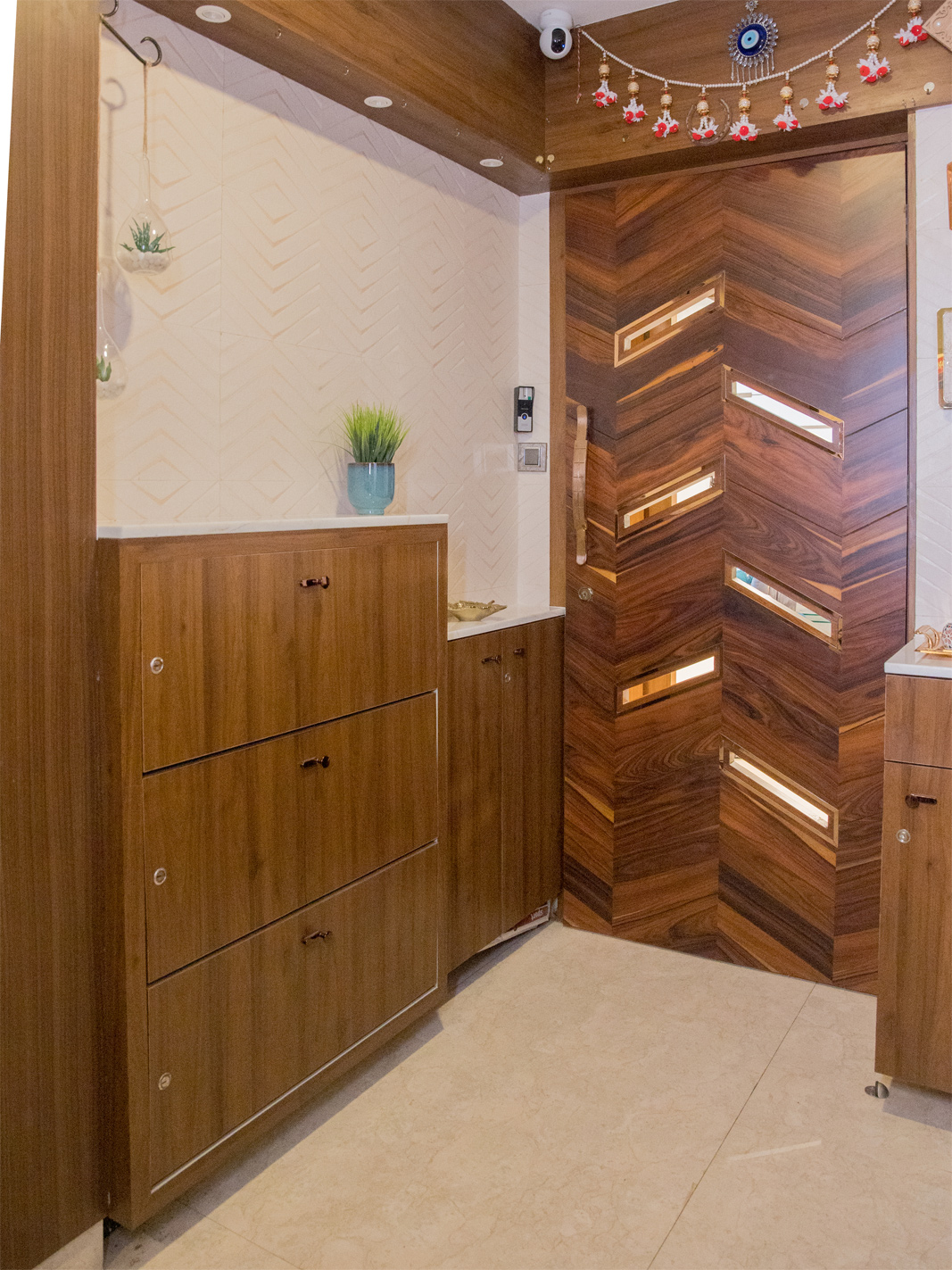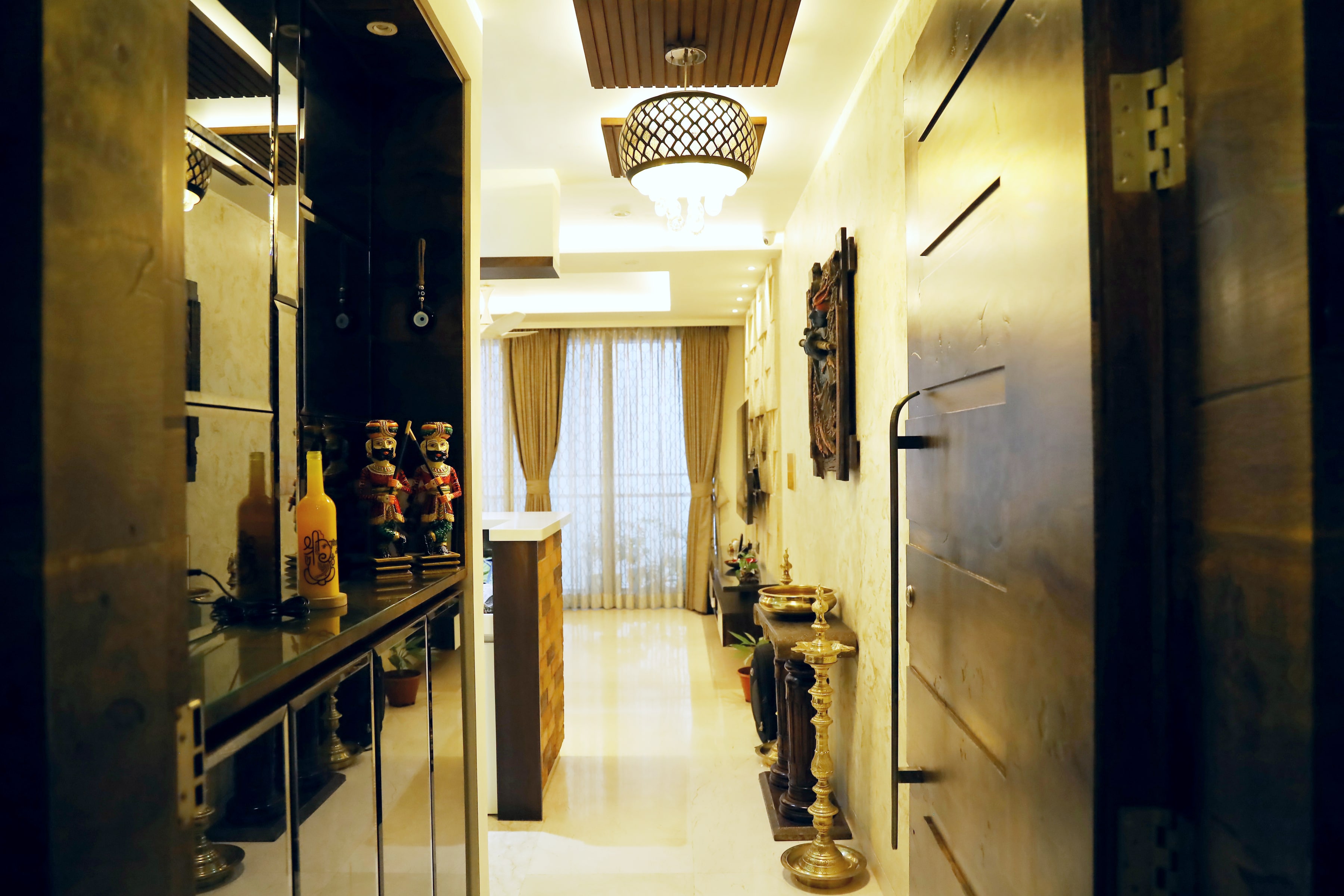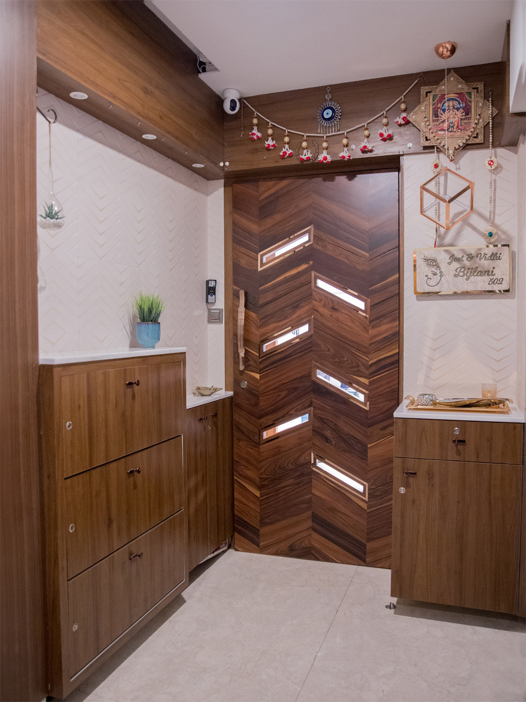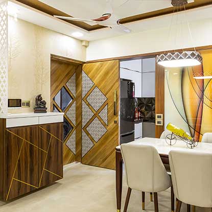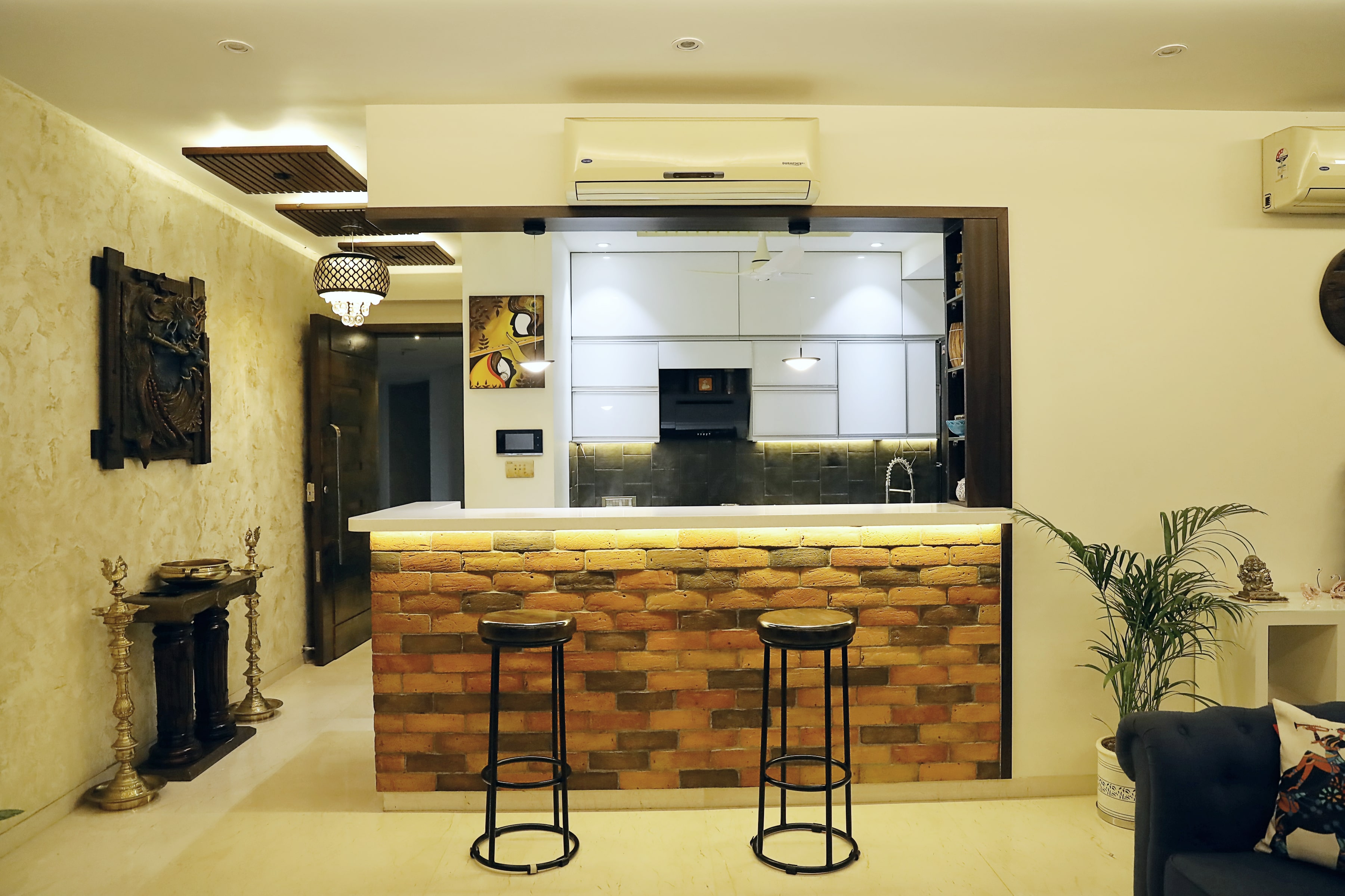 A fusion of modern & classic styles, this vintage-styled Home is composed of warm hues, wood veneers, brick & stone finish tiles, textured walls with warli art & brass idols.