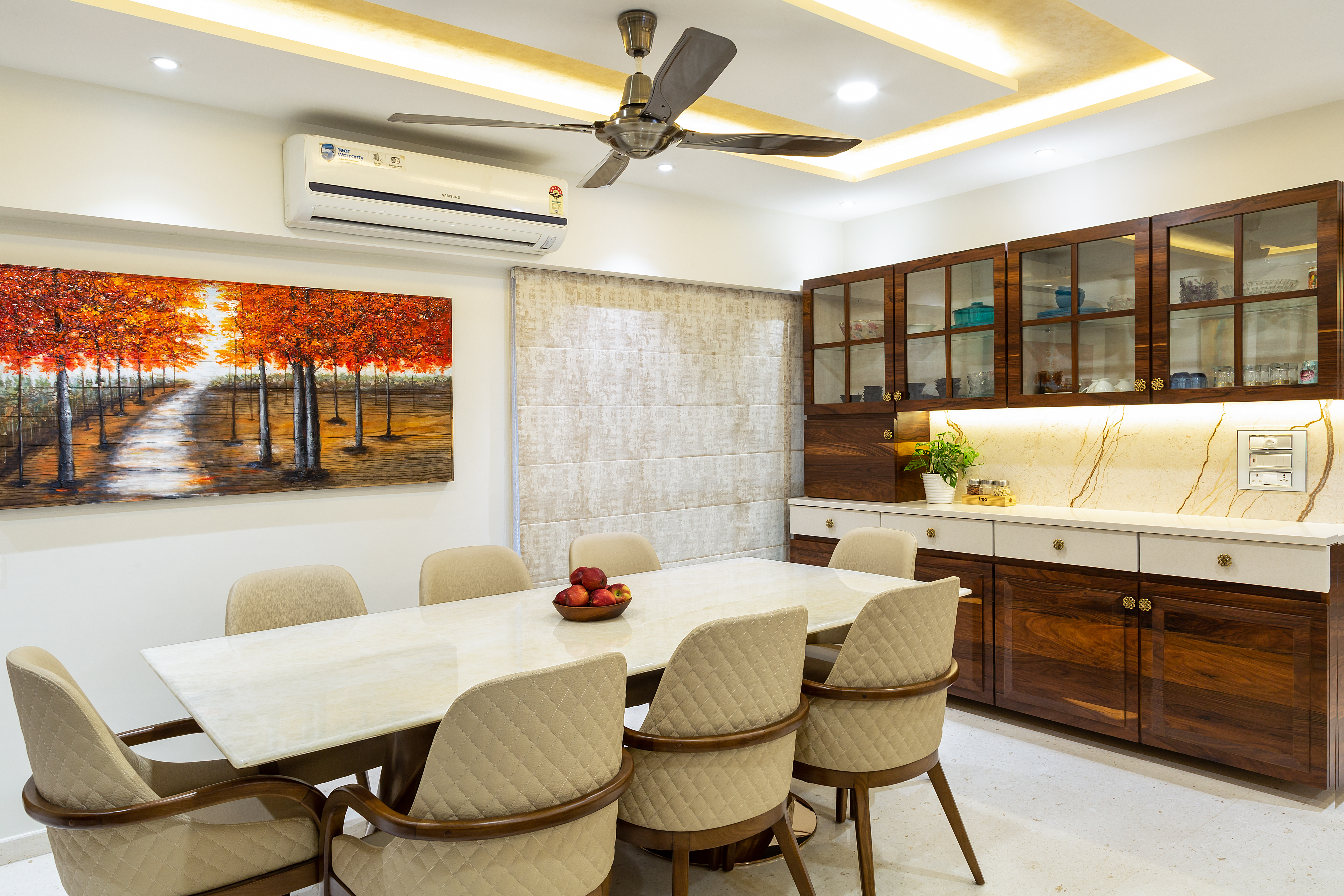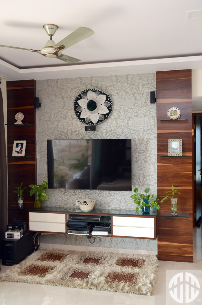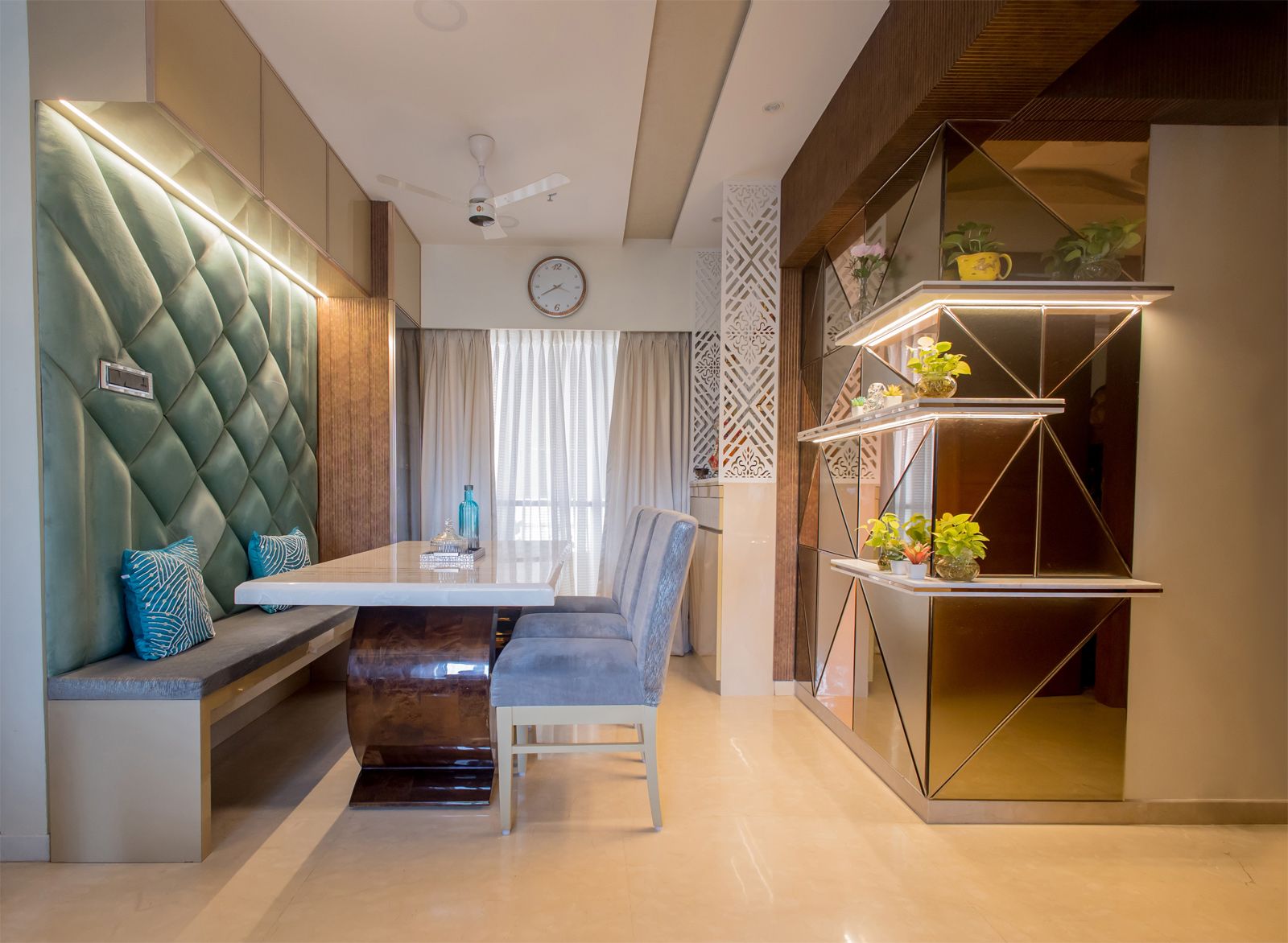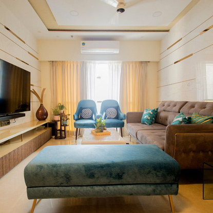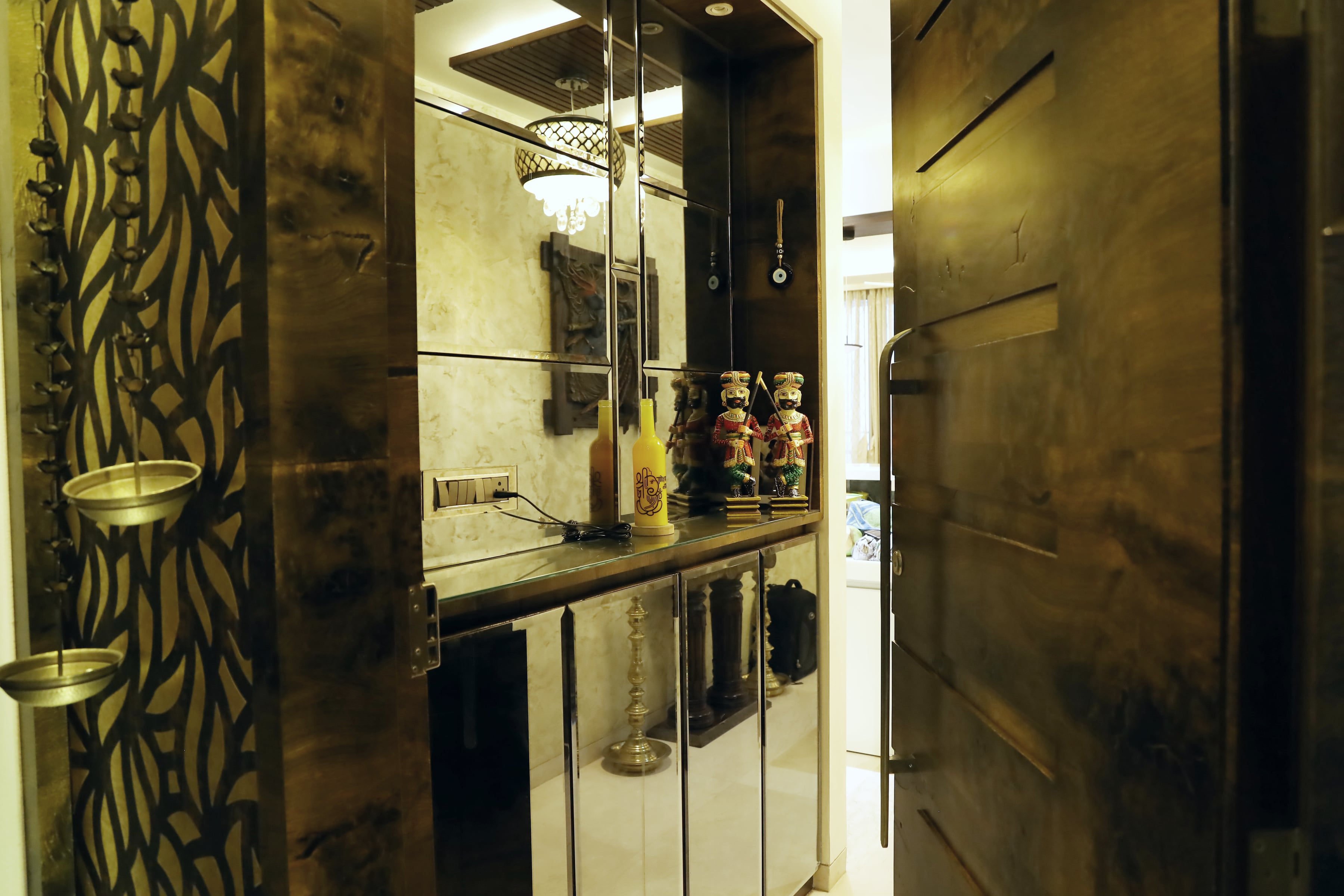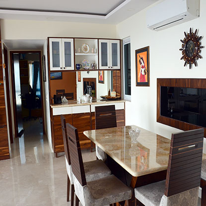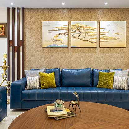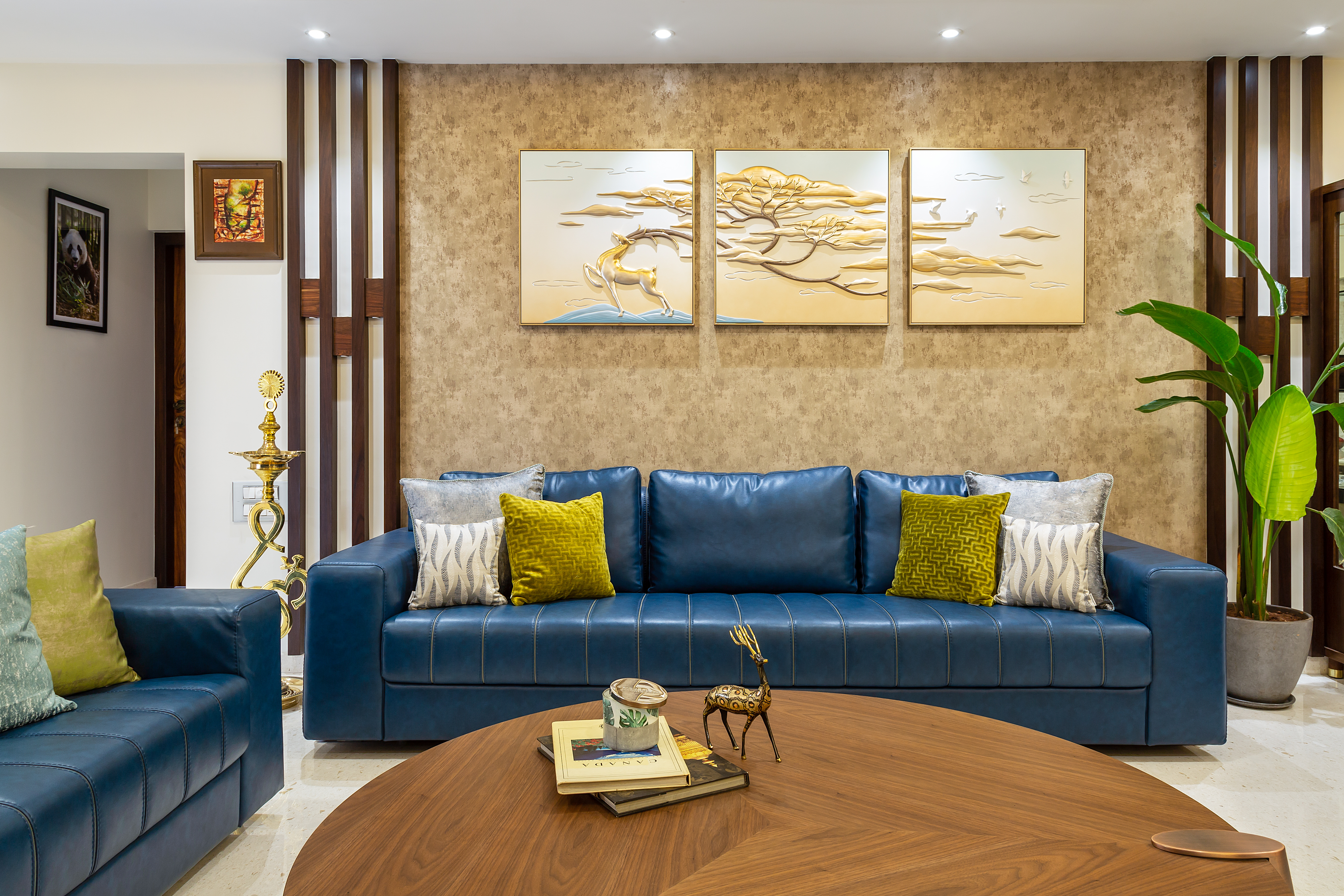 A fusion of modern & classic styles, this vintage-styled Home is composed of warm hues, wood veneers, brick & stone finish tiles, textured walls with warli art & brass idols.