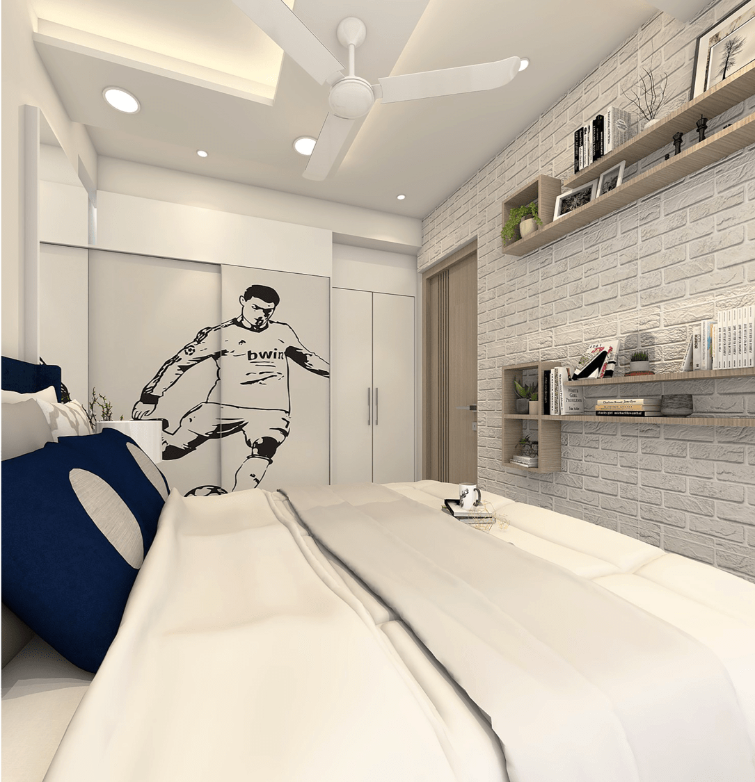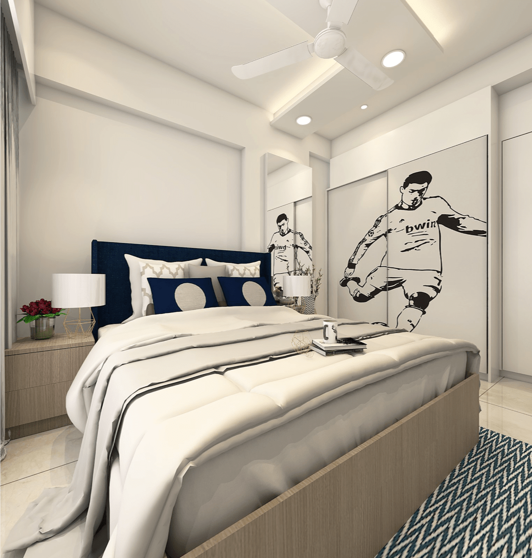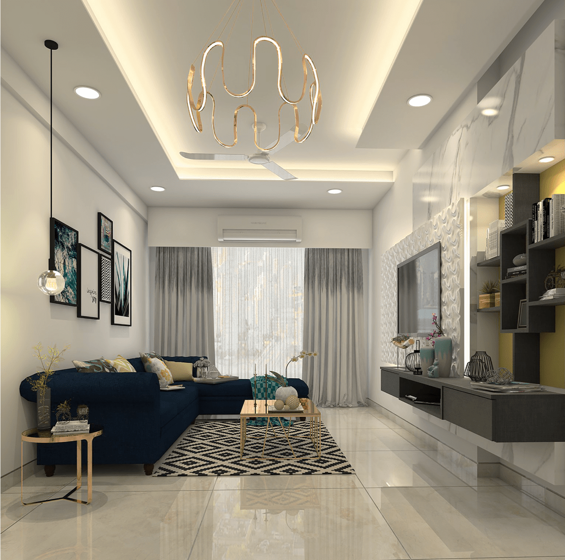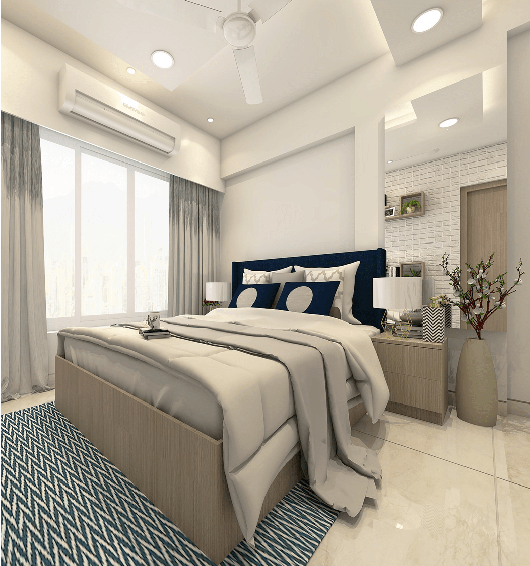 This Home is the very definition of a comfortable, refined modern home with white & blue hues. A thin wooden partition was used to enhance the space. (Rendered Image)