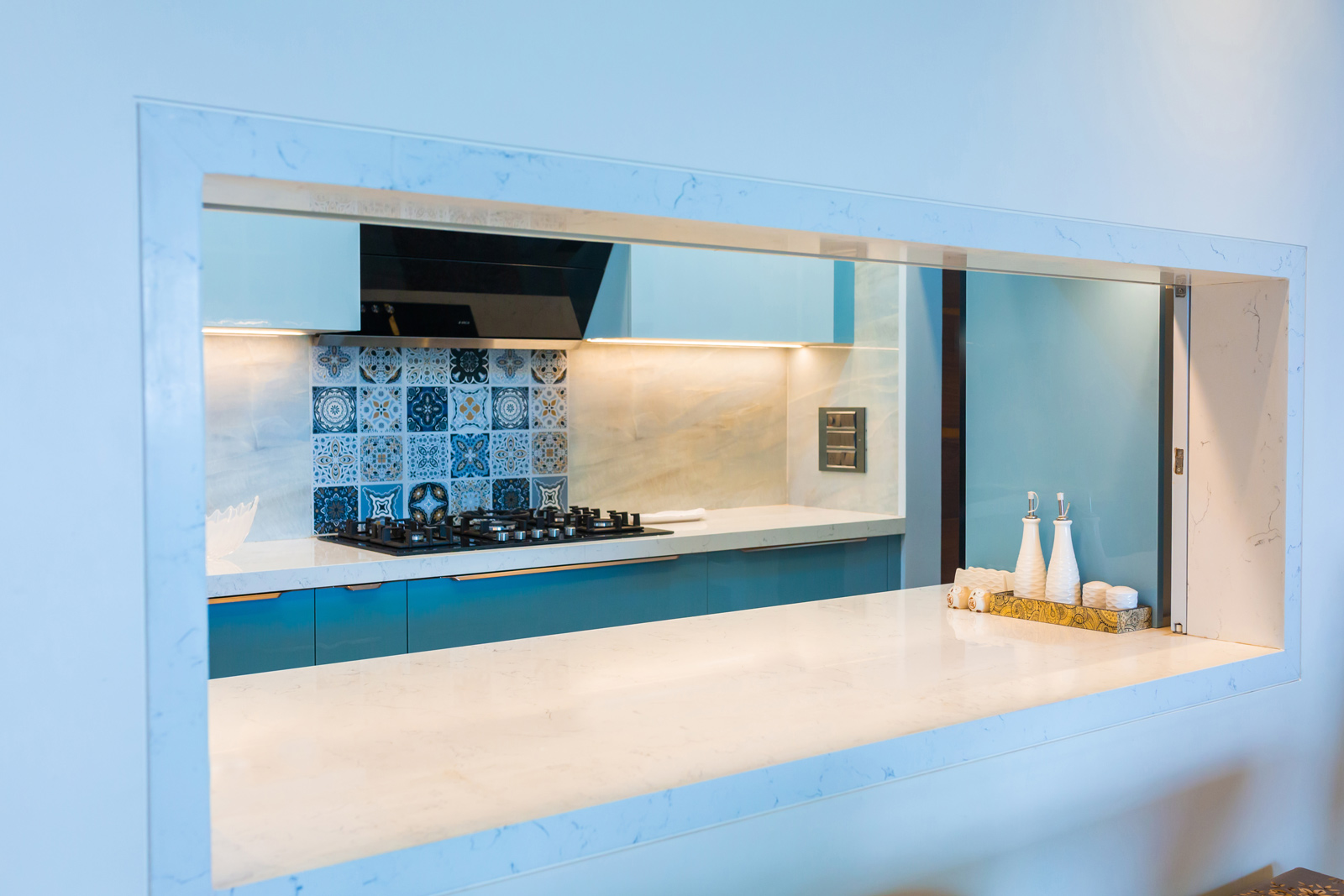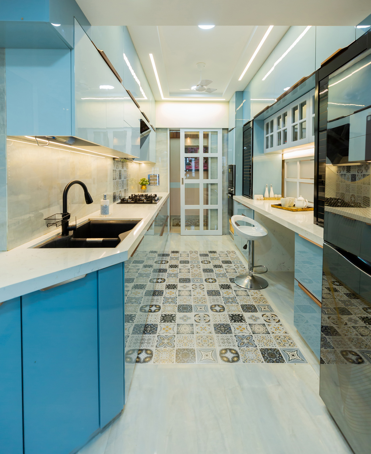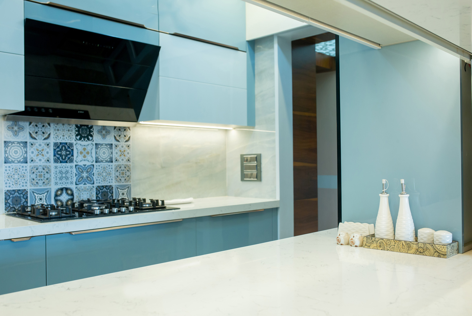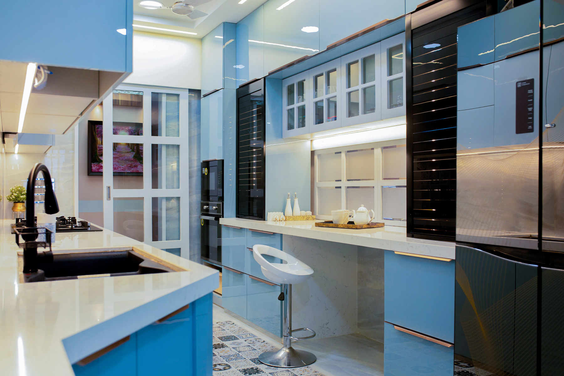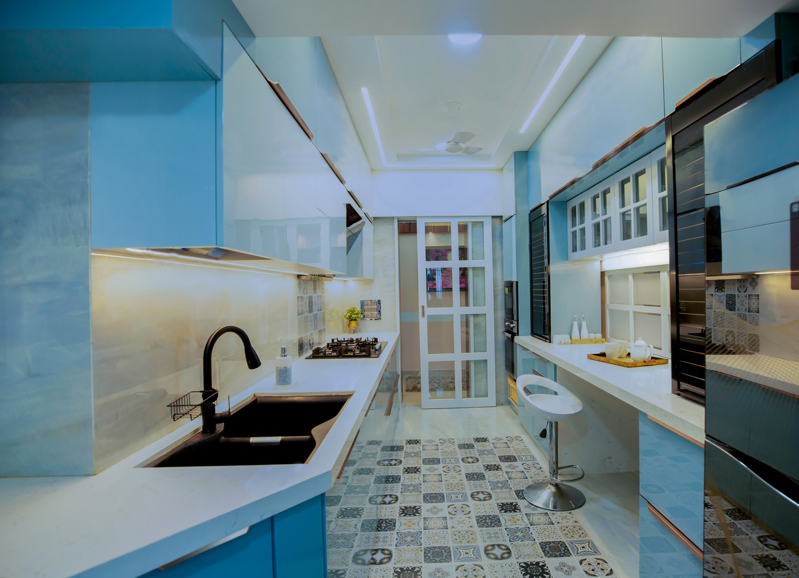 This kitchen gets a makeover by creating ample counter space ,easy to maintain acrylic blue shutters and plenty of storage.