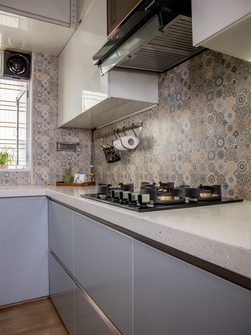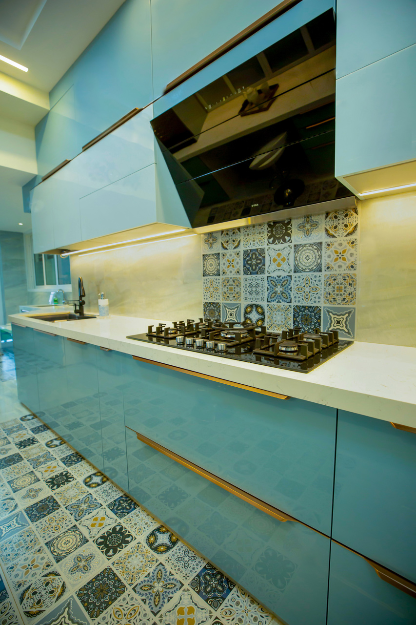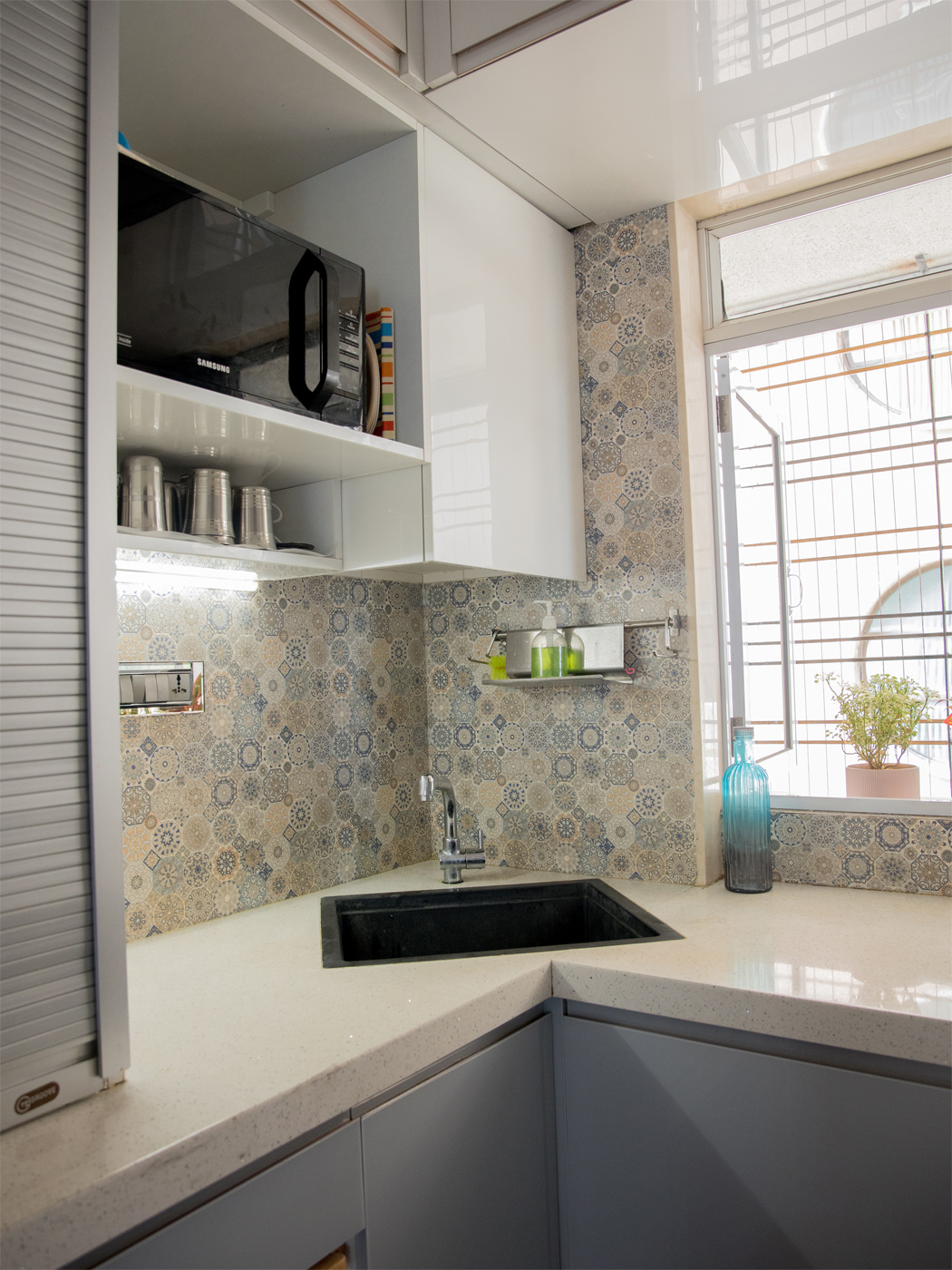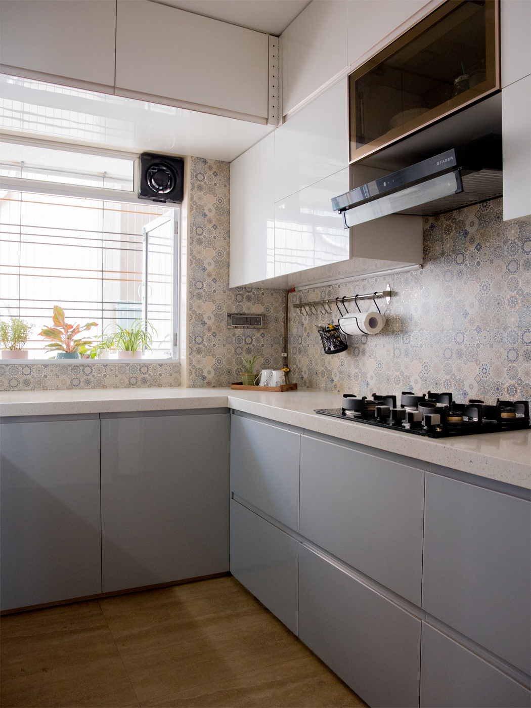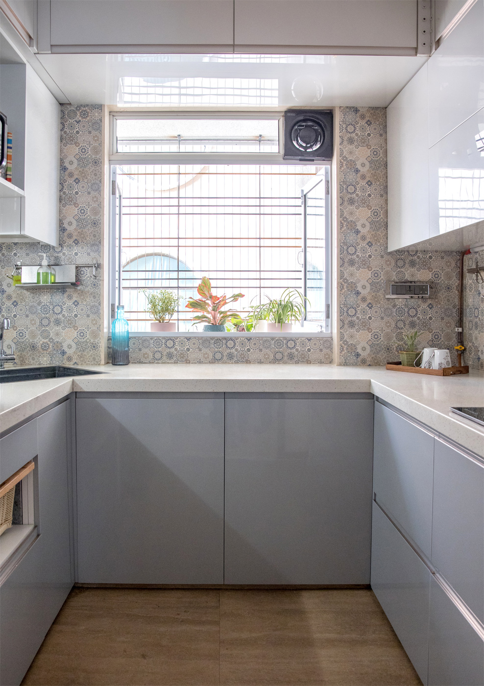 This kitchen gets a makeover by creating ample counter space ,easy to maintain acrylic blue shutters and plenty of storage.