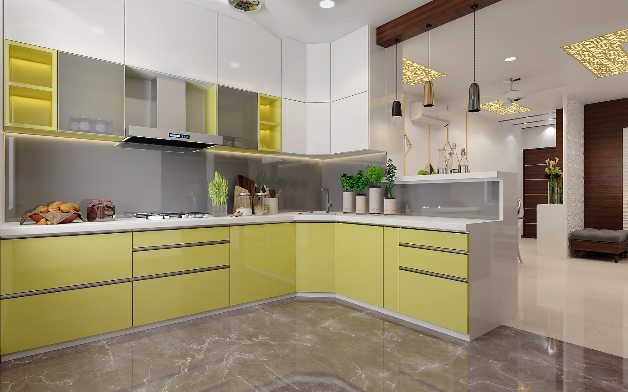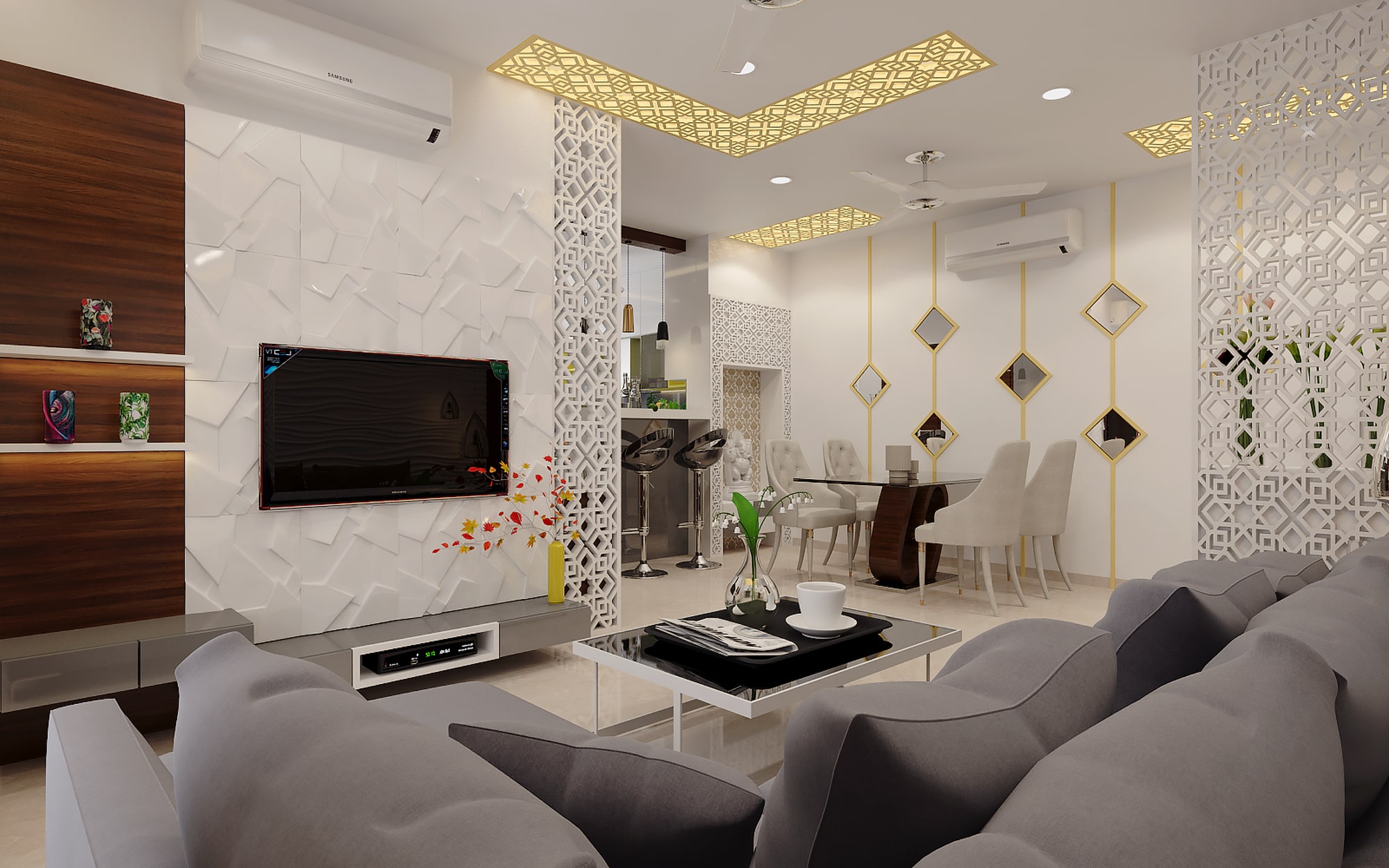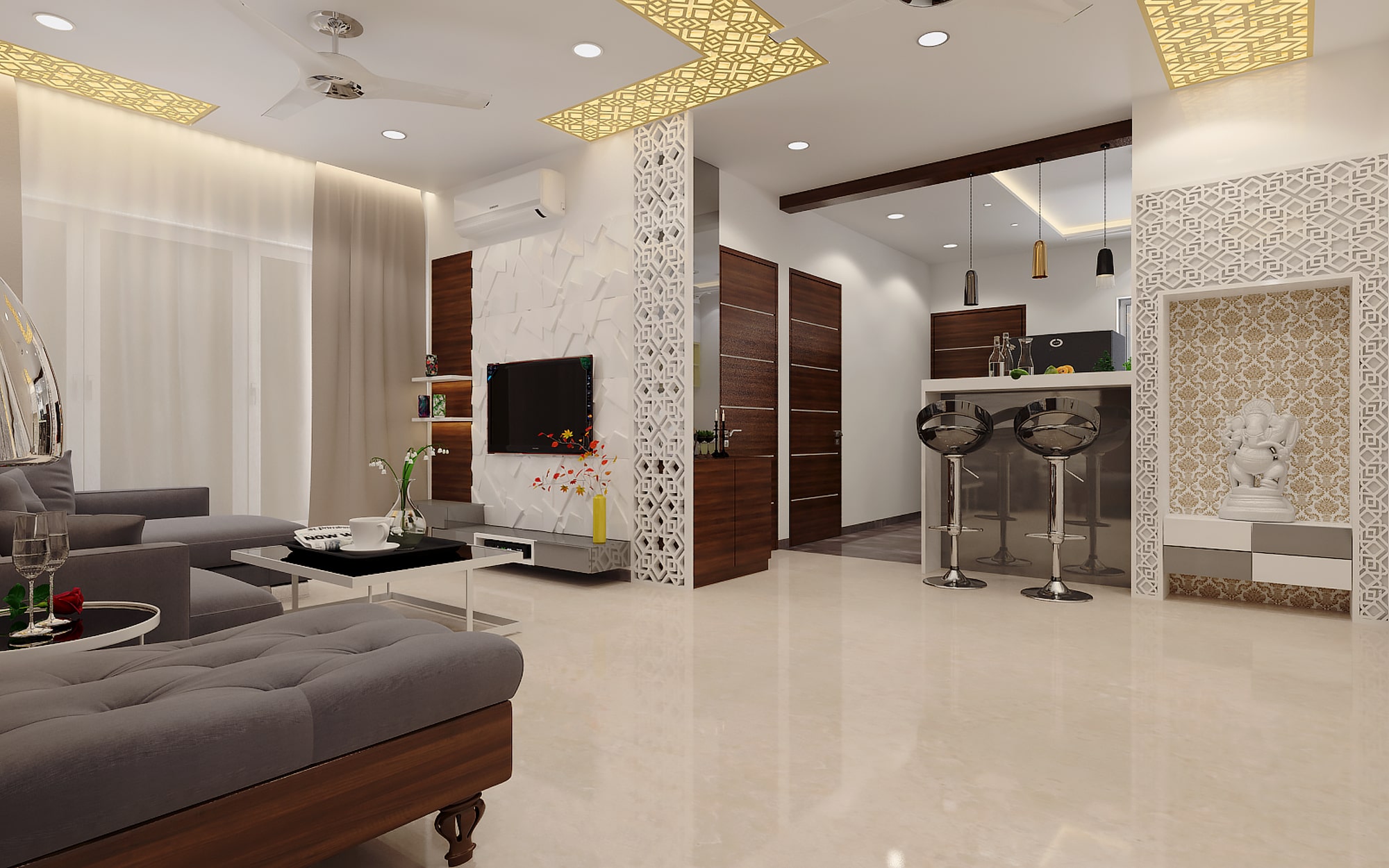 This contemporary home with an open-planned modular kitchen & Jaali-detailing in various places exemplifies ultra-modern living with traditional elements. (Rendered Image)